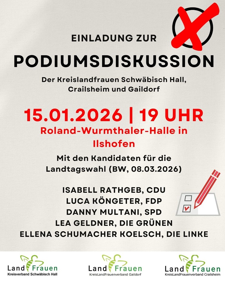 Gemeinsam mit den KreisLandFrauen Schwäbisch Hall und Crailsheim laden wir anlässlich der Landtagswahl am 8. März 2026 zu einer Podiumsdiskussion mit Kandidaten aus unserem Wahlkreis ein.